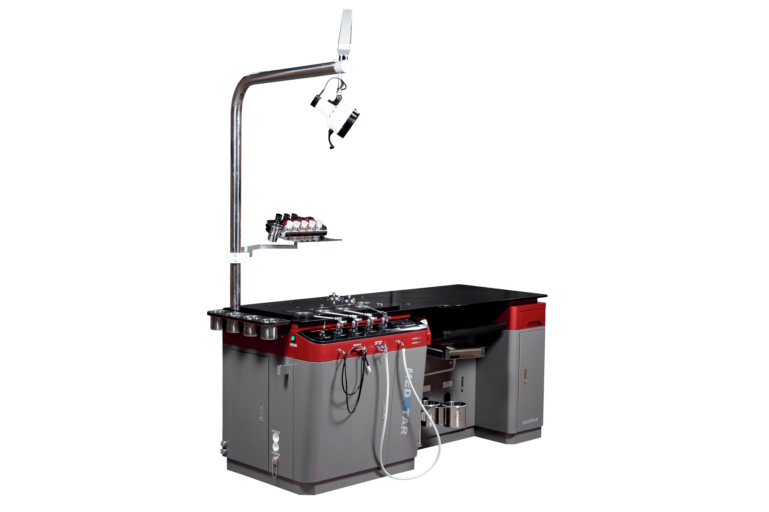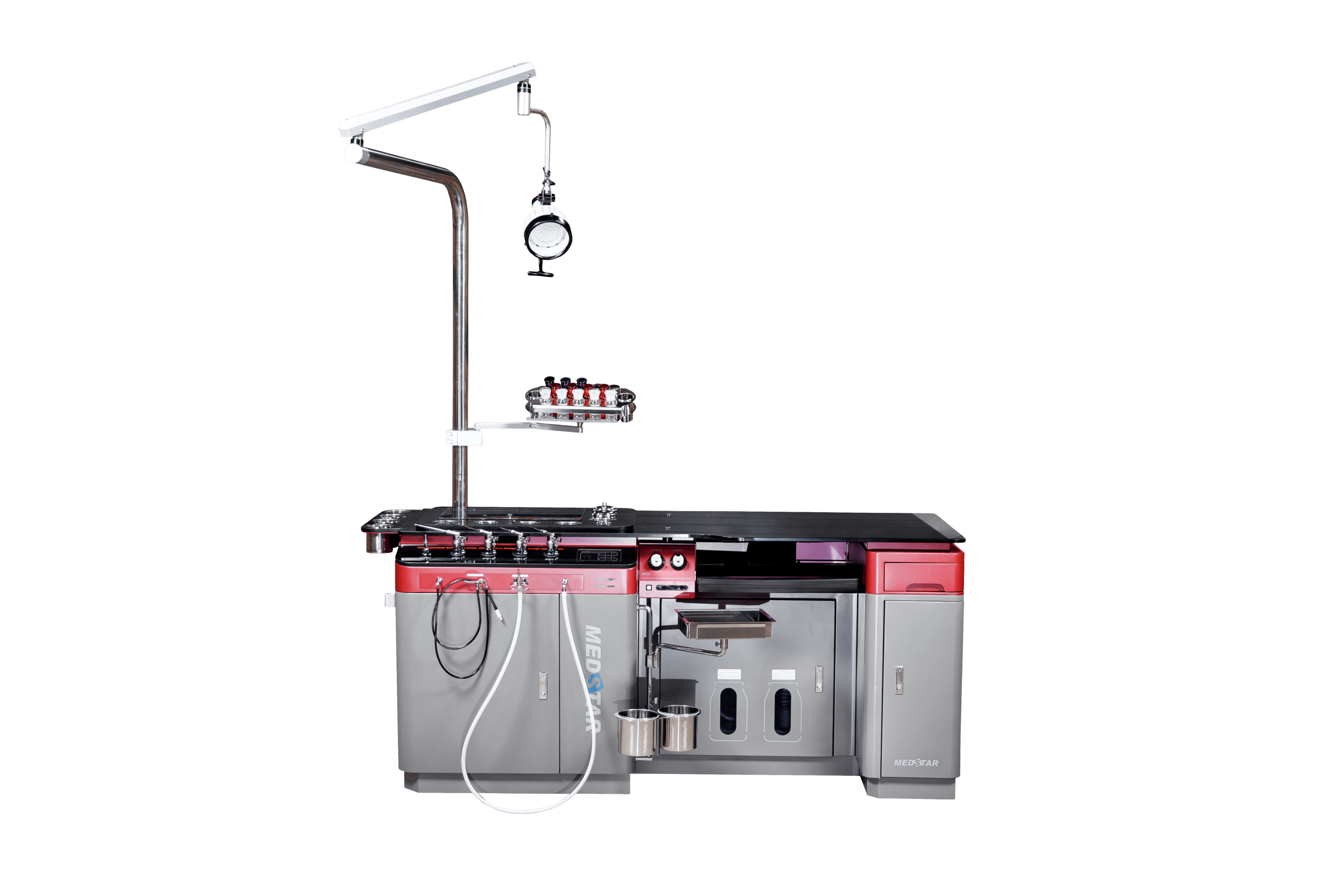 Широкая рабочая поверхность столешницы выполнена из закалённого стекла без геометрически сложных конструкций, позволяя легко и эффективно её обрабатывать. На корпусе имеется множество стаканов и объёмный лоток для хранения стерильного инструментария. Под единой столешницей может располагаться весь требуемый инструментарий рабочего места врача, размещая не только дополнительное оборудование, но и персональный компьютер в специальном отсеке.
